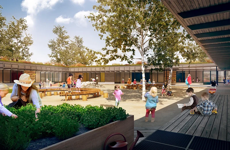 Totalentr. nybyggnad bostäder, garage och förskola.